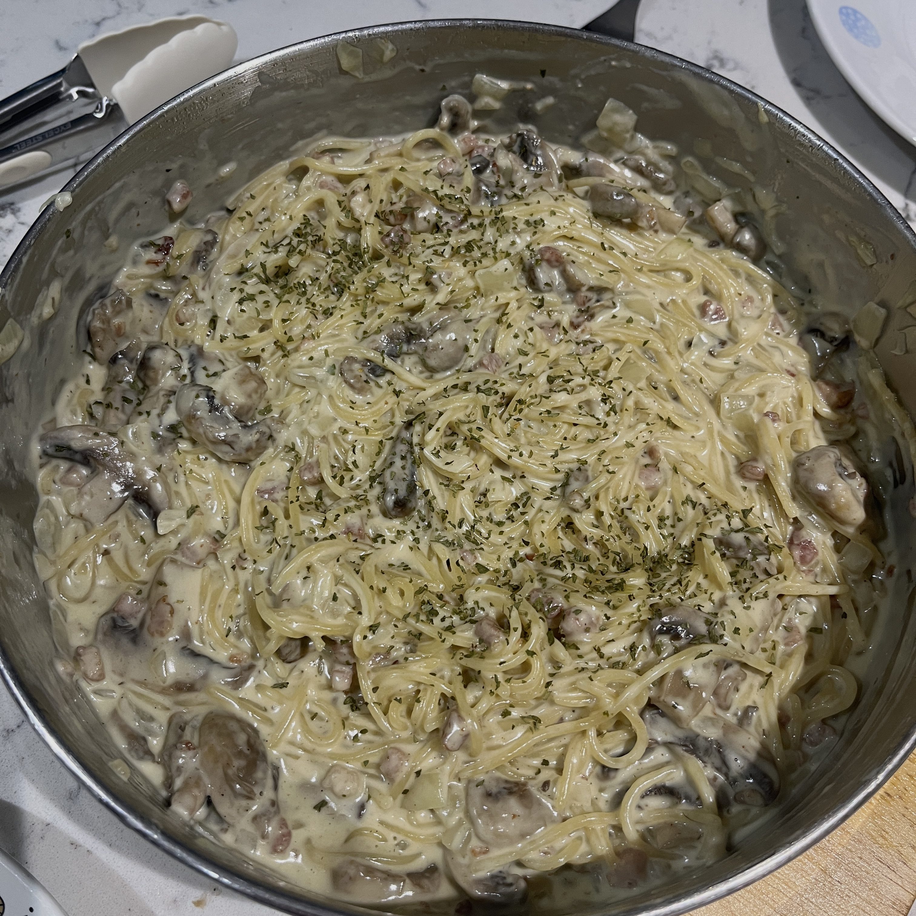 Once the spaghetti was perfectly soft and the stock had mostly been absorbed, I poured in some double cream, making everything rich and velvety. Then, I added the bacon and mushrooms back in, letting it all simmer together until it reached the perfect creamy consistency.